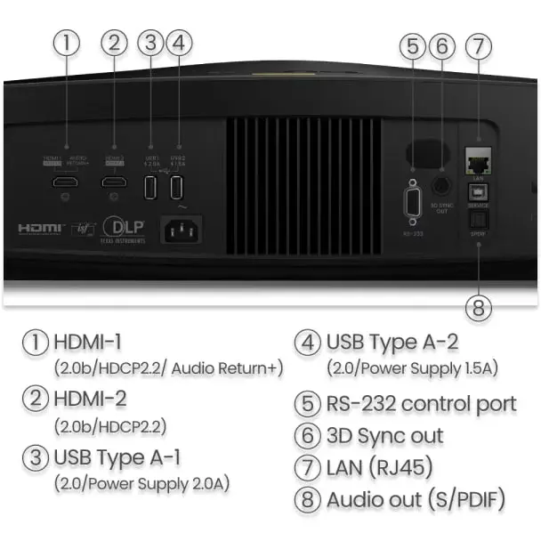 The W5800 connects you to all kinds of entertainment with universal ports including dual HDMI 2.0b (HDCP 2.2)*, two USB Type-A ports, SPDIF, and EARC that allows 7.1 channel audio pass-through and Dolby Atmos, transmitting the original full-resolution audio signal to your sound system over a single HDMI cable.