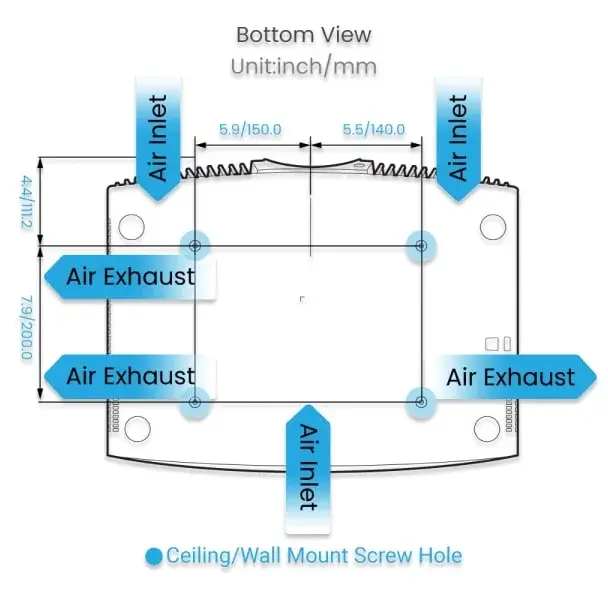 Vertical air intake vents expel dust from the cooling system.
