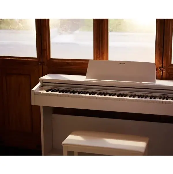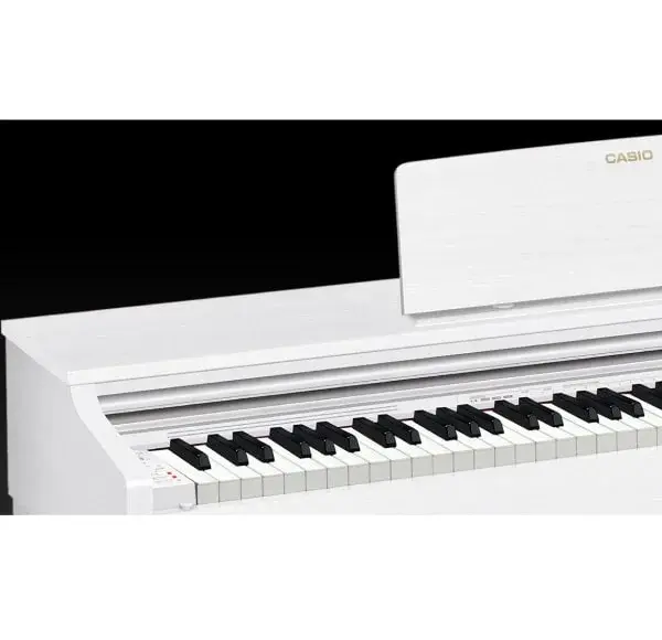 Sound Technology Unprecedented Natural Reproduction of the Rich Expressive Power and Resonance of an Acoustic Piano Multi-dimensional Morphing AiR Sound Source The characteristics of CASIO’s newly developed Multi-dimensional Morphing AiR*Sound Source reflect thorough attention to detail in expressing the rich, resonating tones inherent to the piano. The capacity of the installed memory has been expanded to achieve a longer sampling duration and enhanced waveform data quality. The temporal changes in tone that create sound you would expect only from a piano, beginning with the initial sound and leading into a beautiful extension until the sound eventually vanishes, are reproduced naturally. *AiR = Acoustic and Intelligent Resonator Selection between 2 legendary grand piano sounds The installed sounds of two world-renowned grand pianos are separately selectable, depending on the genre of the music being played and the performance environment. Direct selection is enabled. A superior instrument for powerful, richly reverberating performances. It reproduces classic grand piano sounds across the range from soft, delicate tones to strong, powerful tones, depending on the weight of the keystrokes. GRAND PIANO 1 (graphic image) This is the right choice for bright, luxuriant performances. It makes its presence felt with crisp, straightforward sound, even when being played in a band. Its tonality is ideally suited to jazz and pop music. GRAND PIANO 2 (graphic image) Keyboard System Natural Playing Feel Approaching That of a Grand Piano Firm Touch That Converts the Player’s Thoughts into Sound Tri-sensor Scaled Hammer Action Keyboard II, with a grand piano’s unique sounding timing The difference between the sound structures of a grand piano and a digital piano appears as a difference in timing, from the moment the instrument is played until the sound is audible. The new Tri-sensor Scaled Hammer Action Keyboard II responds by incorporating a system with three sensors that detect touches of the keys sequentially. Simulated ebony and ivory keys with optimal fingertip fit for playing ease The Simulated ebony and ivory keys offers the luxurious feel and texture as well as the smooth touch of a grand piano keyboard. The minutely detailed crimp surface finish inhibits finger slippage due to sweat and gives the sensation of a perfect fingertip fit, even when playing for extended periods. An unprecedented evolution of the digital piano Damper Resonance achieving a more naturally beautiful resonance than a pedal The deep, beautiful resonance resulting from the use of a damper pedal is also reproduced naturally by a stereo resonance simulator installed on all 88 keys, an approach that differs from conventional simulated reproduction employing effect processing. The attention to detail goes so far as to simulate the resonance created by the lifting of the dampers themselves when the pedal is pressed. Concert Play High-quality audio data recordings of 10 live orchestra performances are installed. Pianists can play along with the recordings and enjoy the feeling of participating in a magnificent performance. Versatile features 22 high-quality tones including stereo-sampled grand piano tones Digital Effects: Reverb (4 types), Chorus (4 types), Brilliance, DSP (preset for some tones) Connection to App ( Chordana Play for Piano Special Site ) Lesson feature using 60 Music Library songs plus 10 user loaded songs Duet Mode enabling two people to play in the same range MIDI Recorder: 2 tracks x 1 song, approximately 5,000 notes total GRAND PIANO 1 button, GRAND PIANO 2 button Slide-type keyboard cover Auto Power Off Specifications Basic Information Keyboard Tri-sensor Scaled Hammer Action Keyboard Ⅱ (Key Surface Finish: Simulated ebony and ivory keys) Number of Keys 88 Touch Response 3 sensitivity levels, off Sound Source Multi-dimensional Morphing AiR Maximum Polyphony 192 Number of Tones 22 Built-in Songs 60 Demonstration Songs Song Expansion (User Songs): 10 songs (max.) Up to approximately 90 KB / song Lesson Function Part on/off (Part Select: Right hand, Left hand) Recorder [MIDI Recorder] 2 tracks, 1 song Approximately 5,000 notes total Real-time recording Pedal 3 built-in pedals (damper, soft, sostenuto) Half-Damper Pedal Operation: Yes Speaker 12 cm x 2, 2-Speaker Amplifiers 8 W + 8 W Power Supply [AC Adaptor] AD-E12150LW (DC 12V) Power Consumption 18W Dimensions 1,417 x 432 x 821 mm (w/o music stand) Weight 36.6 kg Color white