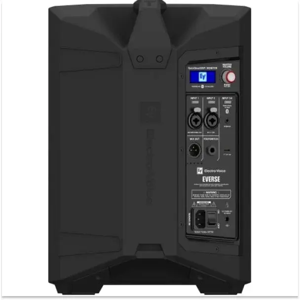 The first battery-powered loudspeaker from Electro-Voice and the first weatherized model of its type, EVERSE 8 takes advantage of decades of Electro-Voice engineering expertise - along with the latest advancements in technology - to provide a truly portable and truly wireless audio experience at a price and performance level unmatched by current comparable products on the market. Whether used for live music, vocal reinforcement and/or audio playback, musicians, DJs, production/rental companies, fitness/activity instructors and other professional, amateur and recreational users can all benefit from EVERSE 8’s superior sound quality, user-friendliness and all-in-one PA system design - a concept that opens-up real pro-audio performance for a wider range of users than ever before. EVERSE 8 comes in a black or white finish, adding an aesthetic angle to its versatility. Designed to deliver a step up in sound quality for the battery-powered portable PA segment, with high SPL and full-bandwidth coverage Compact, lightweight and weatherized design coupled with extended battery life - longer run time for gigs and events, indoors or outdoors Flexible all-in-one feature set, including QuickSmart Mobile app and Bluetooth® for best-in-class control and streaming, an onboard mixer and studio-quality effects - a user-friendly and versatile choice for musicians, DJs, fitness/activity instructors, events/gatherings and more REAL PRO-AUDIO PERFORMANCE With a maximum SPL rating of 121 dB and wide, even 100º x 100º coverage, EVERSE 8’s capabilities defy its compact form factor and set uncompromising new benchmarks for its product segment. Core components include an 8” woofer mounted using EV’s patented SST (Signal Synchronized Transducers) port design, and a high-output titanium tweeter mounted onto a custom constant-directivity waveguide. And, as with all Electro-Voice portable loudspeakers, EVERSE 8’s system reliability is verified with extensive music abuse and endurance testing. BATTERY-POWERED CONVENIENCE EVERSE 8 is powered by a custom-designed high-capacity Li-ion battery pack, fully optimized for audio use and providing plentiful power for up to 12 hours of run time. Protection circuitry reduces the risk of the battery discharging to such a low voltage that it can no longer be recharged - for example, after long periods in storage. Tool-free screws make removing the battery pack effortless. Uncompromising sound quality, unplugged. IP43-RATED WEATHERIZED DESIGN In combination with the rugged polypropylene enclosure, use of the included weatherized input cover allows EVERSE 8 to meet the IP43 rating (water resistant for splashes and light rain) when running on battery power and while Bluetooth® streaming. Built-in feet with no-skid rubber pads ensure the system stays put. Bring EVERSE 8 outside for busking, marching band practice, or the backyard BBQ, or wherever a PA is needed, whatever the forecast. COMPACT & LIGHTWEIGHT Every detail of EVERSE 8 is designed to maximize easy lifting and transportation - all while reinforcing EV’s reputation for real-world durability. An ergonomically designed soft-touch handle and premium lightweight construction make it a breeze to move and mount EVERSE 8. Pack it into the optional tote bag and head out to the gig. It’s the all-in-one pro-audio system you can grab to go. EXPANDABLE FUNCTIONALITY The integrated 12 V DC port provides convenient power from the EVERSE 8 battery, perfect for powering a wireless microphone system such as the Electro-Voice RE3 or R300 (see user manual for details). Attach the optional accessory tray to the top of an EVERSE 8 to secure receiver hardware in place. A charging port is included for mobile devices if a top-up is needed when streaming. Place on a tripod for a longer throw, set long-side down as a stage wedge using the 55° monitor angle, or use upright with the 30° kick-back angle to project up off the performance area. For stereo setups, EVERSE 8 is equipped for Bluetooth® true wireless stereo streaming. POWERED BY DYNACORD EVERSE 8 is driven by a high-efficiency Class-D amplifier and DSP module developed in collaboration with the world-class audio electronics engineering team at EV’s sibling brand Dynacord. Pro features include a built in four-channel digital mixer with studio-quality effects and processing, 48 V phantom power, feedback suppression and audio ducking. Between the EV and the D badges, you get the best of both worlds. WIRELESS CONTROL & MONITORING Use the EV QuickSmart Mobile app to adjust all audio, effects and mix functions via your phone or tablet. An intuitive user interface makes it simple to shape your sound to the space, so you can focus on the show. 1) The EVERSE 8 battery pack will provide 12+ hours at 95 dB SPL average with typical program material, or 6+ hours at maximum output level before limit indication. 2) Always use the supplied weatherized input cover, or the Electro-Voice approved accessory rain resistant cover in wet or damp environments. 3) Two EVERSE 8 loudspeakers are required for true wireless stereo via a Bluetooth® connection. The Bluetooth® word mark and logos are registered trademarks owned by Bluetooth SIG, Inc. and any use of such marks by Bosch Security Systems, LLC is under license. Specifications Frequency response (-3 dB) 1 60 Hz to 20 kHz Frequency range (-10 dB) 2 50 Hz to 20 kHz Max. SPL 3 121 dB Coverage angle (H x V) 100° x 100° Amplifier rating 400 W