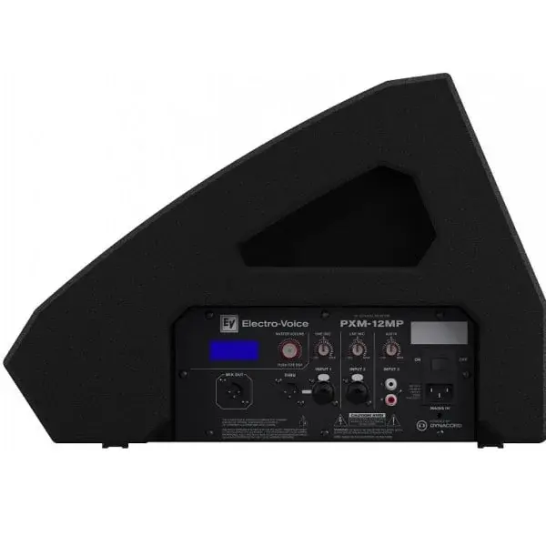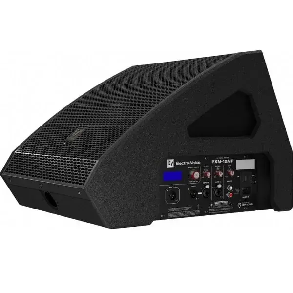 Multi-functional monitoring system that is usable as a floor wedge or as a mains PA Acoustically optimized 55° monitor floor angle QuickSmartDSP : Features best-in-class processing. Easy setup via four presets, sub/top system-match, three-band EQ, five user-programmable presets, visual monitoring of limiter status, input level control and meters, and master volume control to optimize gain structure, all via LCD. GUITARCAB Setting : Makes it easy for guitarists to dial in their signature tone. 700 W Class-D Power Amplifier : Designed by Dynacord, delivers up to 129 dB peak SPL utilizing transducers by EV. System Reliability : Verified with over 500 hours of abuse and endurance testing. The PXM-12MP is a dedicated portable loudspeaker system designed to provide musicians, DJs, and audio engineers convenient and powerful monitoring and playback functionality. By providing a symmetrical 90° x 90° coverage pattern facilitated by a 12” / 1.75” coaxial driver, users can experience solid, consistent coverage, which ensures that their mix can be heard clearly without constraining them to a limited part of the stage. The 55° monitoring angle enables users to stand as close or as far away from the system as necessary without sacrificing audio intelligibility. An integrated pole mount at the front allows for additional applications such as fills, delays, or a main PA. With a dedicated subwoofer and the adjustable subwoofer matching LPFs of the PXM-12MP, a full 3-way system can be configured to create an extremely compact main PA. The integrated mixing section provides three input channels: 2x XLR / ¼” combination connectors and a stereo RCA input. The DSP offers four EQ presets, high and low shelving, parametric midrange EQs, adjustable low-cut filters, a tunable feedback notch filter, and recallable user settings. The Class-D 700W amplifier provides enough power to satisfy the most demanding monitoring requirements, and system protection and limitation designed by Electro-Voice ensures that the PXM-12MP will play loudly and consistently even at the edge of its specifications. Specifications Frequency response (-3 dB) : 64 Hz - 20 kHz Frequency range (-10 dB) : 53 Hz - 20 kHz Monitor Angle : 55°