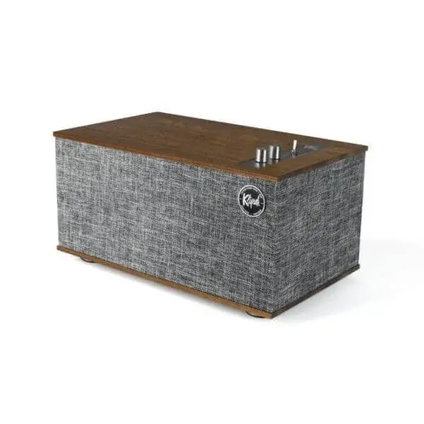 The Klipsch The Three II wireless speaker with walnut finish delivers rich, warm audio with vintage design elegance.