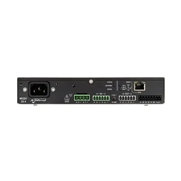 The Powersoft Mezzo 322 A is a 2-channel compact amplifier that delivers 320 watts of reliable power in a space-saving design. With built-in DSP processing, it offers advanced features such as high-pass filters, limiters, gain control, and automatic setup. Its flexible power-sharing technology optimizes performance across various speaker configurations.This amplifier supports remote control and monitoring through integration with third-party systems, making it a perfect choice for fixed installations in commercial venues, conference rooms, and hospitality environments. Its half-rack size and included mounting accessories allow for quick and versatile installation on walls, ceilings, or racks.