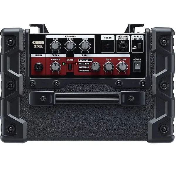 Mini Amp, Big Sound With over one million CUBE amps sold and going strong, Roland continues to push the envelope with innovative amp technology and design. The latest addition to the top-selling CUBE amp family is the CUBE-XL series, with the CUBE-15XL representing the most portable and affordable of the new lineup. The CUBE-15XL offers 15 watts of power through an 8" high-performance custom speaker. There are two discrete channels onboard, Clean and Lead, with three BOSS distortion circuits to choose from, including Metal Zone and the new Extreme. Activate the Power Squeezer to achieve full gain at low volume. Connect portable music players to the Aux In jack and jam along with your favorite songs. 15-watt guitar amp with 8" high-performance speaker Two channels: independent Clean and Lead Four authentic BOSS Lead tones including METAL ZONE, plus new EXTREME Power Squeezer for full gain at low volume AUX IN jack to connect portable music players Power Squeeze Ever wished you could achieve that awesome full-volume sound at a lower level? Power Squeezer gives you a crushing, full-gain tone even at low volume, letting you experience a dense, overdriven sound without blowing the windows out of your bedroom. Enjoy monster tone at any volume setting, from whisper soft to full blast. Five Amps in One The CUBE-15XL is small and portable yet delivers big-time tone! In all, five amp types are available for instant selection. The Lead channel provides four aggressive choices: three BOSS distortion circuits - Overdrive, Distortion, Metal Zone - and Roland’s newly designed Extreme. Each offers its own unique brand of bite. The Clean channel takes you 180 degrees in the other direction with its pure, transparent tone. Aux Input, Record Output You can jam along with your favorite songs by plugging a portable music player into the CUBE-15XL’s Auxiliary Input. Conversely, you can use the Record Output to feed your signal directly into an external recorder, shaping your tone with the CUBE-15XL’s amp models and EQ. The Record Output can also be used as a headphone out for private practice. Specifications Specification Details Rated Power Output 15 W Nominal Input Level INPUT: -10 dBu/1 MΩ AUX IN: -10 dBu Speaker 20 cm (8 inches) Controls POWER Switch, SELECT Switch, POWER SQUEEZER Switch CLEAN Channel VOLUME Knob LEAD Channel TYPE Switch (OVERDRIVE, DISTORTION, METAL ZONE, EXTREME), GAIN Knob, VOLUME Knob EQUALIZER BASS Knob, MIDDLE Knob, TREBLE Knob Indicators CLEAN Channel, LEAD Channel Connectors INPUT Jack (1/4" phone type), AUX IN Jack (Stereo miniature phone type), RECORDING OUT/PHONES Jack (Stereo 1/4" phone type) Power Consumption 18 W Accessory Owner's Manual Size & Weight Width : 335 mm (13-3/16 inches) Depth : 240 mm (9-1/2 inches) Height : 335 mm (13-3/16 inches) Weight : 7.2 kg (15 lbs. 14 oz.)
