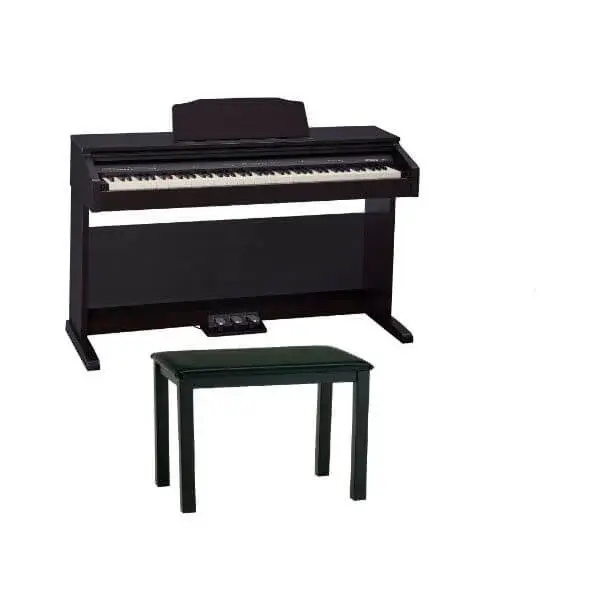 The Roland RP30 digital piano features 88 weighted keys, realistic piano sound, and includes a matching bench – ideal for learners and home use.