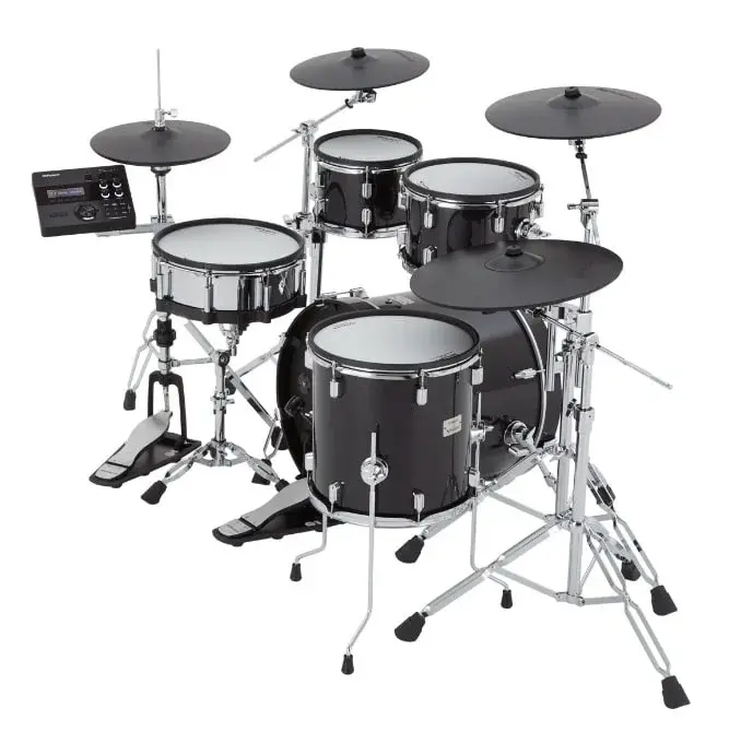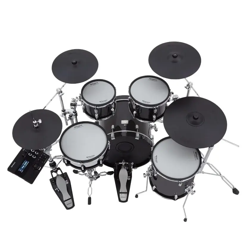 The Original Full-Size V-Drums Acoustic Design Experience The VAD507 delivers the commanding presence of a full acoustic drum set on stage-with the convenience and control of electronic drums. This premium five-piece kit features wood shells with full depth and diameter, covered with attractive wraps and mounted on double-braced chrome stands. Roland’s advanced digital sensor technology and dynamic TD-27 drum module provide the sound and response to match, with every stroke, ghost note, roll, and swell expressed in incredible detail. Building on the previous VAD506 model, the VAD507 adds a digital hi-hat for even greater expression, plus heavy-duty cymbal stands inherited from the flagship VAD706. The TD-27 module has also been updated, bringing you new kits and samples, expanded processing options, and more. Standard Features Five-piece V-Drums Acoustic Design kit with full-size wood shells and upgraded double-braced chrome stands Updated TD-27 sound module with enhanced features and advanced Prismatic Sound Modeling derived from the flagship TD-50X 14-inch PD-140DS digital snare, 12-inch VH-14D digital hi-hat, and 18-inch CY-18DR digital ride cymbal with high-resolution, multi-sensor triggering for unparalleled dynamics and accurate positional detection 10-inch PDA100-MS rack tom, 12-inch PDA120-MS rack tom, 14-inch PDA140F-MS floor tom, and 20-inch KD-200-MS kick with custom chrome hardware and Midnight Sparkle wraps Additional cymbal pads include 14-inch CY-14C-T crash and 16-inch CY-16R-T crash/ride Drum in inspiring sound spaces with PureAcoustic Ambience Technology Hands-on interface for quick-and-easy sound selection and editing Import your own WAV samples via an SD card Stereo mix output and two assignable outputs for sending individual drum sounds to a PA mixer Integrated 28-channel USB audio interface for professional computer music production Three auxiliary trigger inputs for easy kit expansion Onboard Bluetooth® for drumming with music from a smartphone or laptop Built-in practice functions for developing drumming skills TD-27KV2 and VAD 5 Series Overview The updated TD-27 sound module has enhanced features and advanced Prismatic Sound Modeling from the flagship TD-50X. Rock with 75 ready-to-play preset kits, including 10 all-new kits and a variety of new samples, effects, and processing capabilities. An Immersive Acoustic Drumming Experience With the impressive looks, familiar layout, and inspiring playability of a high-end acoustic kit, the VAD507 makes any drummer feel instantly at home. There’s a 14-inch stainless steel snare, plus 10-inch and 12-inch rack toms, a 14-inch floor tom, and a 20-inch kick constructed with full-depth wood shells, adding to the authenticity and providing genuine acoustic feel under the sticks and beater. A full complement of cymbals includes a 12-inch V-Hi-Hat, 14-inch and 16-inch crashes (both with thin profiles and textured finishes), and an 18-inch ride for superior playability and natural appearance on stage. Digital Snare, Ride, and Hi-Hat Roland’s groundbreaking digital pad technology is a major leap forward in electronic drumming, putting unmatched depth and dimension under your sticks. Precision multi-sensors in the snare, ride, and hi-hat pads work in harmony with the TD-27 module to capture every nuance with incredible definition and detail. Lightning-fast detection lets you play all your natural acoustic techniques, such as muting the ride with a finger touch or switching seamlessly between head, rimshot, and cross stick playing on the snare. And the VH-14D takes the electronic hi-hat to new heights with unparalleled touch sensitivity, tonal variation, and open/closed resolution. The Natural Feel of Acoustic Drums Roland’s legendary multi-ply, tension-adjustable mesh heads contribute significantly to the authentic playing feel, giving you stick rebound that’s customizable for your playing style. And when you bury the beater into the specially designed kick drum, you physically move air inside the shell, creating air pressure and resistance that feels remarkably like playing an acoustic kick. Go Deeper with Prismatic Sound Modeling Derived from the flagship TD-50X, the TD-27 sound module is filled with drums that live and breathe like acoustic instruments. We start by sampling the finest drums, percussion, and cymbals-both vintage and modern-in world-class recording studios. Roland’s unique Prismatic Sound Modeling is then applied to the samples, bringing them alive with proprietary behavior modeling refined over two decades. Every time you strike a drum or cymbal, you’re not simply triggering a canned sound-you’re playing a full-bodied instrument that responds like its acoustic counterpart in every way, putting unprecedented sonic range at your command. Create (and Craft) Your Signature Drum Kit With acoustic drums, you make the sound your own by swapping head types, adjusting the tuning, applying damping, tweaking the snare wire tension, changing the kick beater, and more. This is all possible with the TD-27 module, allowing you to craft customized kits for any situation. Just strike a pad to select it and use the hands-on controls and intuitive editing tools to get the sound just how you like it. Your edits are saved automatically too, so you always stay focused on playing. It’s even possible to load your own samples and layer them with the internal sounds to personalize kits even more. Bluetooth Audio Streaming Built-in Bluetooth lets you wirelessly stream audio from a phone or laptop to the module-ideal for jamming with headphones. Play along with backing tracks and your favorite bands, or mix the sound from a YouTube lesson video with the kit. You can even record your performances-with or without backing-to hear where you need to tighten things up.